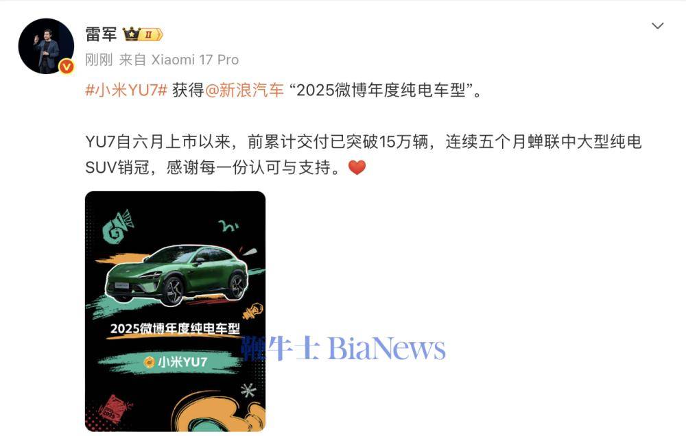 小米YU7斬獲2025微博年度純電車型殊榮,雷軍發文致謝認可與支持