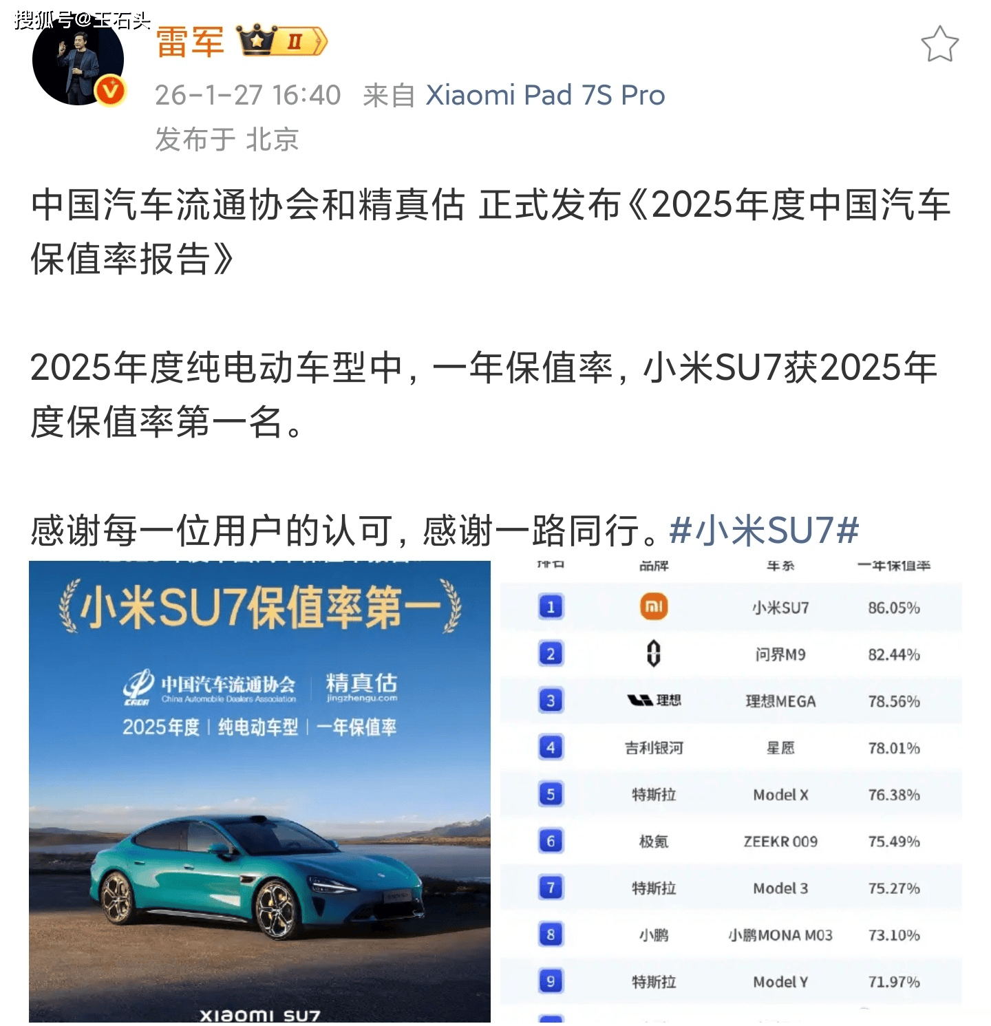 官方數據力證!小米SU7保值率登頂,國產新能源正改寫電動車市場格局