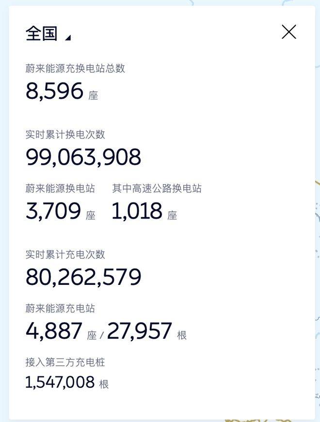 蔚來汽車在新能源領域的布局正持續深化。根據最新披露的數據,蔚來能源充換電站網絡已覆蓋全國,總數達到8596座,實時累計換電次數突破9906萬次,距離1億次里程碑僅一步之遙。這一數據通過加電地圖實時更新,直觀展現了用戶對換電模式的高接受度。