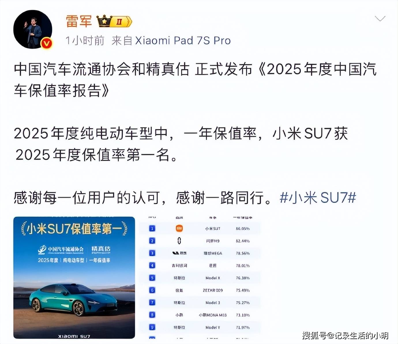 近日,中國汽車流通協會攜手精真估發布的《2025年度中國汽車保值率報告》引發廣泛關注,小米SU7憑借86.05%的一年保值率,在純電動車領域脫穎而出,成功登頂榜首。這一消息迅速在汽車圈掀起熱議,小米集團創始人雷軍也在第一時間通過微博向用戶表達感謝,足見這份成績對小米汽車的重要意義。
