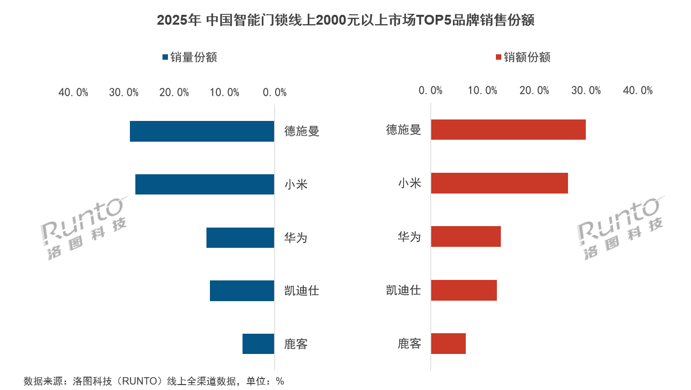 奧維云網在報告中指出,2025年,中國智能門鎖行業在技術門檻提升、用戶品牌認知增強等因素驅動下,市場資源加速向優勢企業聚集,中長尾品牌生存空間收窄。在傳統電商渠道,TOP5品牌零售量占比接近60%,TOP10品牌合計份額超過75%,頭部效應愈發顯著。其中,德施曼位居線上市場(含傳統電商與內容電商)零售額榜首,在線上2000元及以上價格段市場中實現量額雙第一,領跑高端市場。