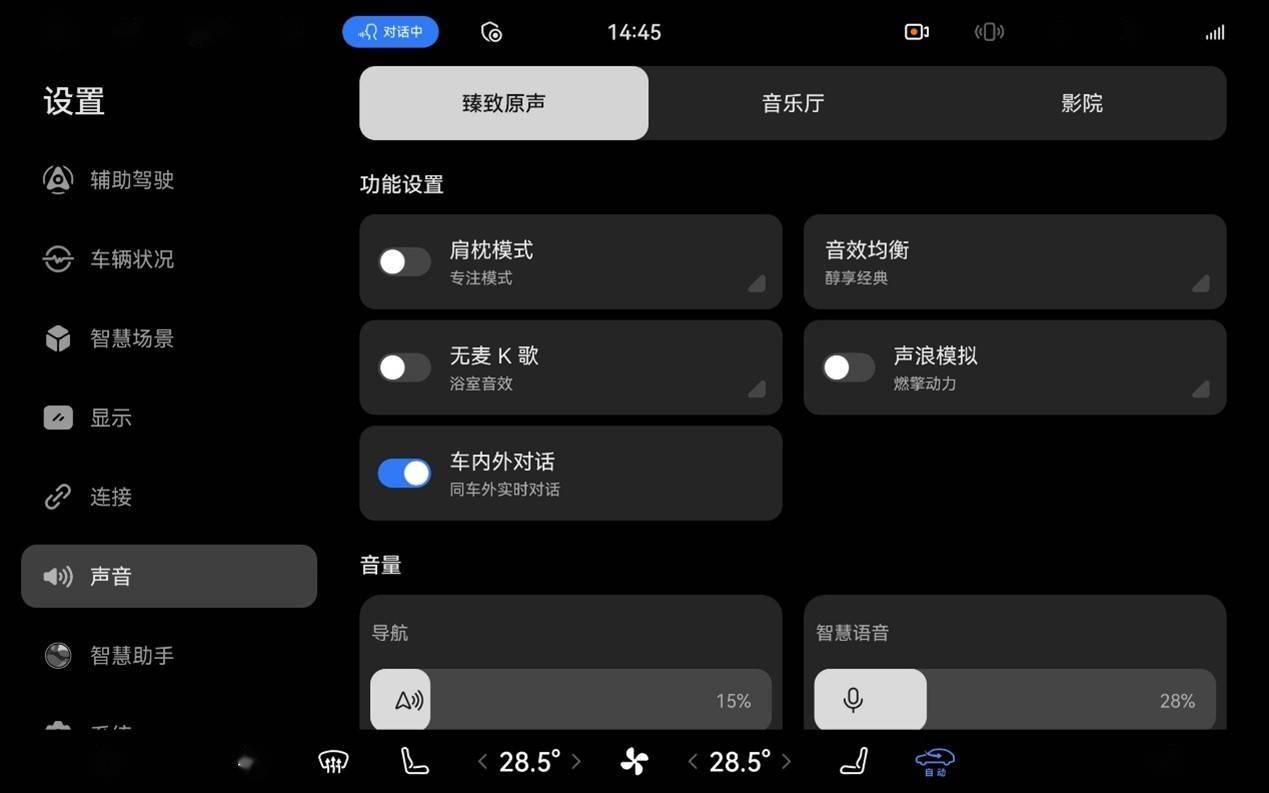 新增功能中,車內外對話功能尤為引人注目。通過車外麥克風,用戶無需打開車窗即可與車外附近人員進行雙向對話。該功能可通過設置-聲音-功能設置路徑開啟,同時支持方向盤自定義按鍵快捷操作,極大地方便了用戶在不同場景下的使用需求。