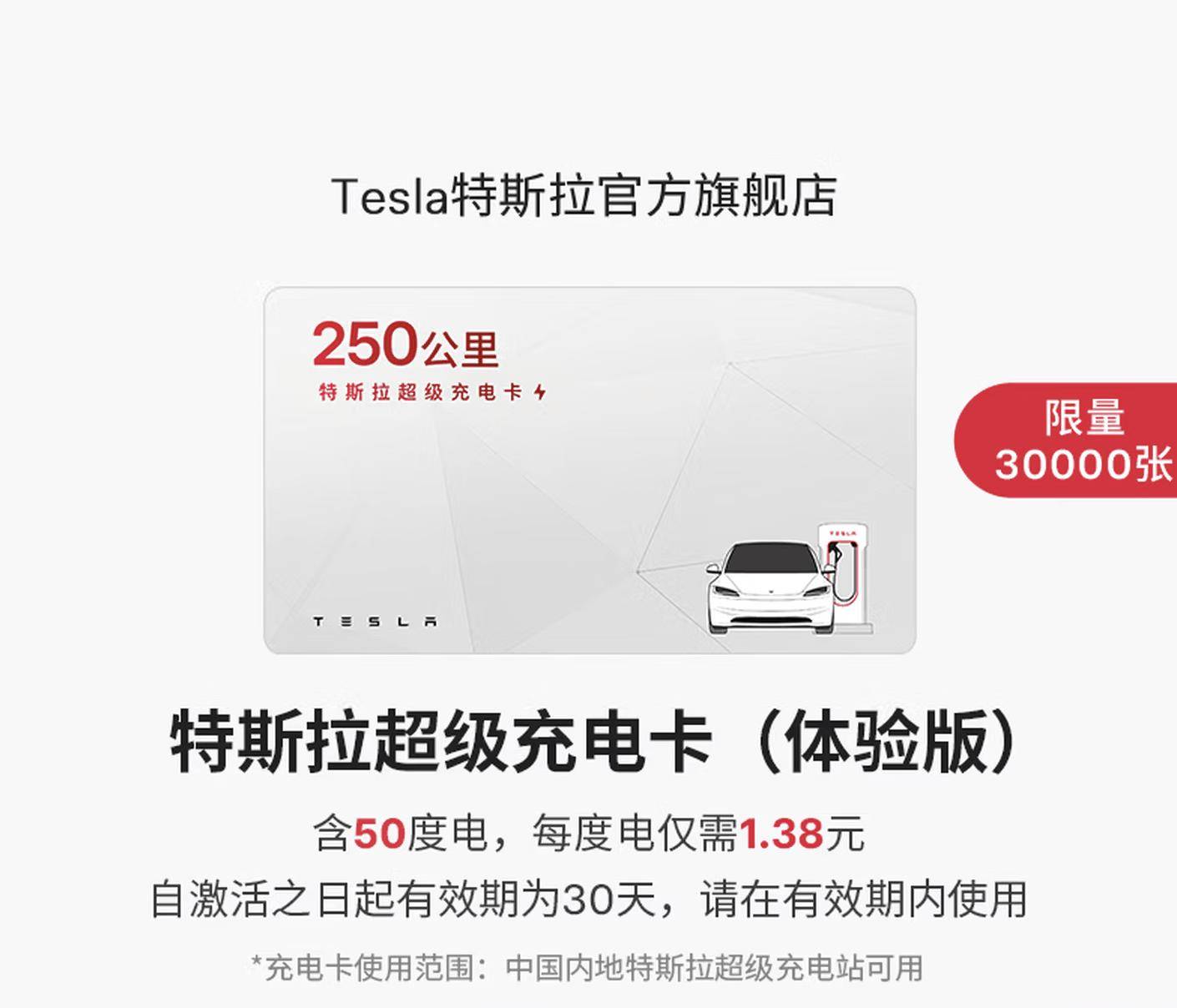 其中,超級充電卡(體驗版)補貼后售價為69元,包含50度電,折合每度電1.38元。以Model 3后輪驅動版為例,官方稱該電量可支持約250公里的里程補能。該版本充電卡需在購買后30天內激活,激活后電量有效期為30天。