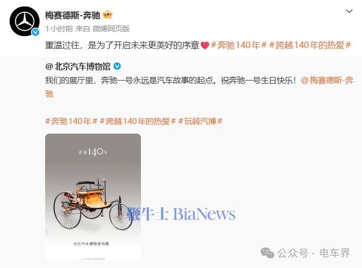 吉利汽車特別強(qiáng)調(diào)中國(guó)車企的全球地位,以"來(lái)自中國(guó)汽車全球領(lǐng)跑者的'吉'時(shí)祝福"表達(dá)祝賀。奔馳方以"借你'吉'言,奔馳路上,吉利相伴"的回應(yīng),既體現(xiàn)文化共鳴又彰顯開(kāi)放胸懷。北京汽車博物館同步曬出展廳中的"奔馳一號(hào)"實(shí)車照片,為這場(chǎng)行業(yè)慶典增添歷史厚重感。