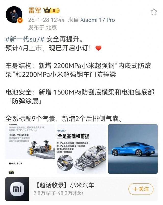 小米汽車官方近日宣布,其全新一代SU7車型在安全性能方面實現重大突破,預計將于今年4月正式推向市場。目前,該車型已啟動小規模預訂服務,引發消費者廣泛關注。