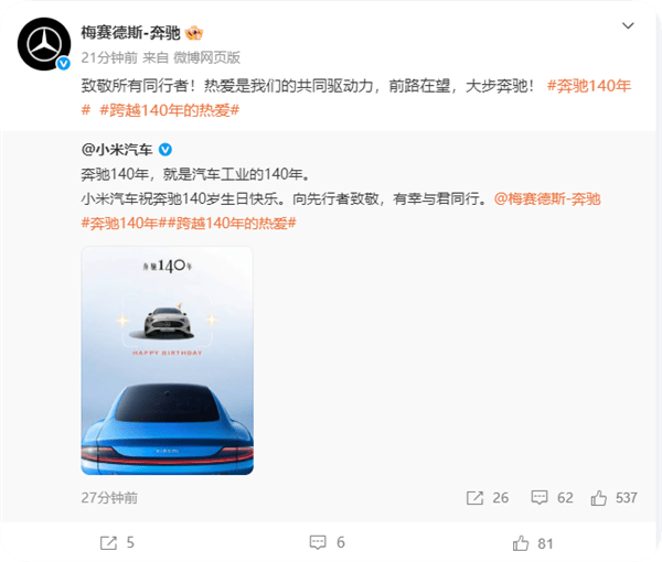 隨后,小米集團(tuán)創(chuàng)始人雷軍也發(fā)聲致敬行業(yè)先行者,祝愿奔馳140周歲生日快樂,進(jìn)一步彰顯了行業(yè)內(nèi)的友好氛圍與對(duì)前輩的尊重。