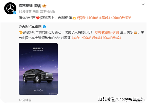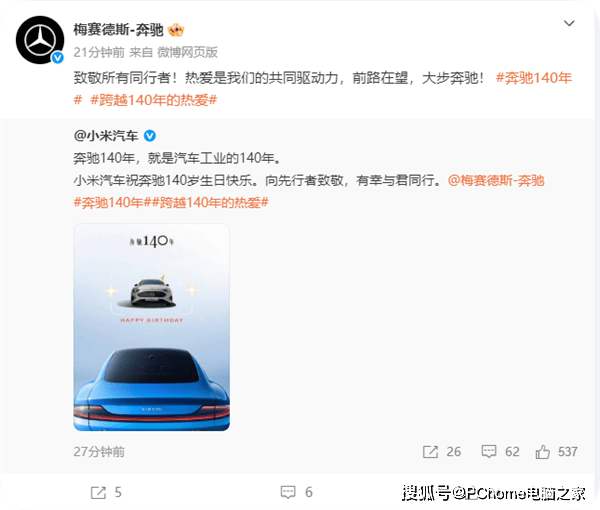 這場行業盛典引發廣泛共鳴,小米汽車、理想汽車、蔚來、吉利、凱迪拉克、奧迪、鴻蒙智行等國內外車企通過官方賬號集體發聲。小米官方微博以“奔馳140年,就是汽車工業的140年”為題,強調“向先行者致敬,有幸與君同行”,創始人雷軍更親自轉發該條內容。奔馳官方隨即回應:“致敬所有同行者!熱愛是我們的共同驅動力,前路在望,大步奔馳!”雙方互動被網友稱為“教科書級行業聯動”。