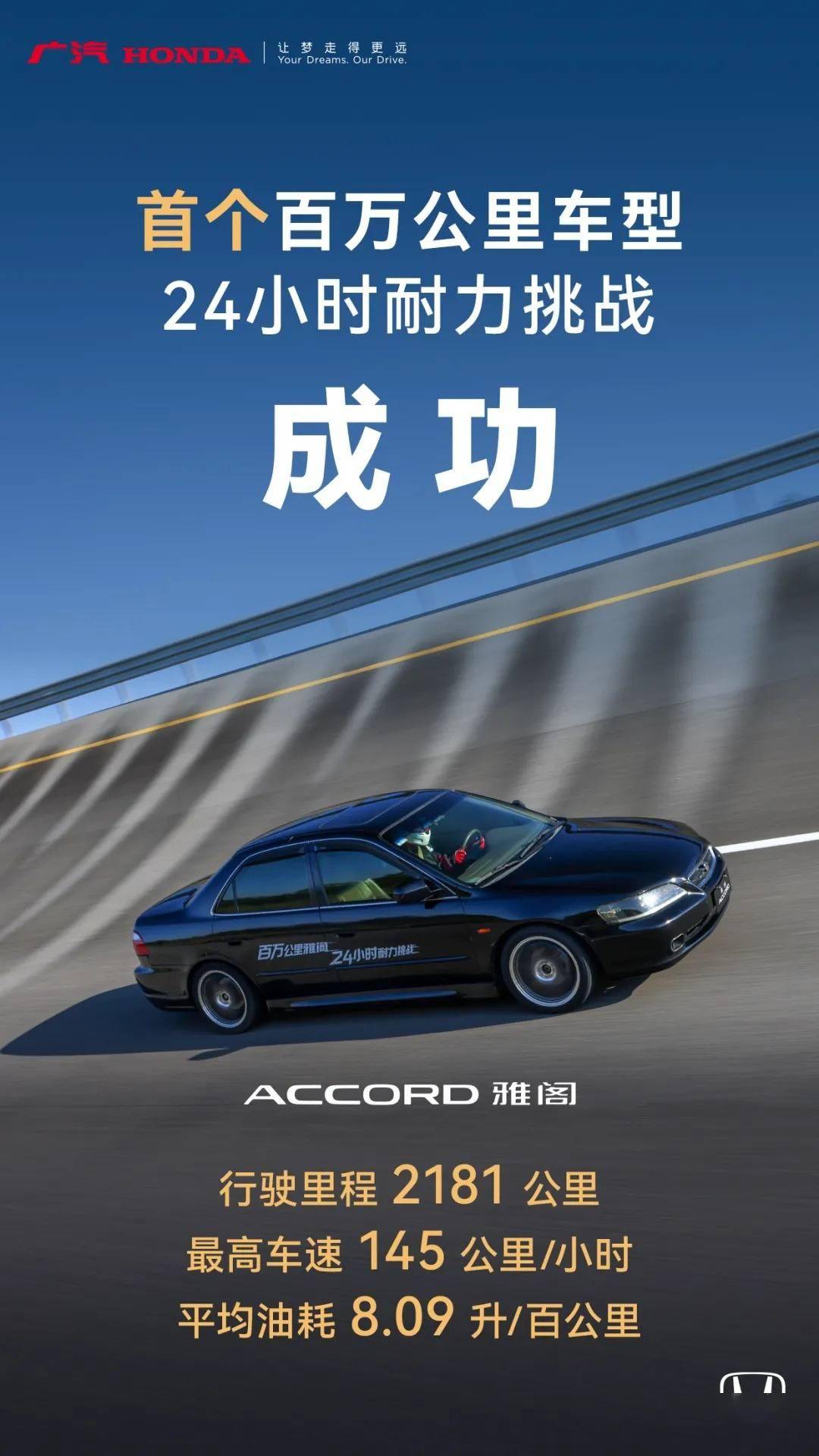 廣汽本田近日宣布,其主導的行業首個百萬公里車型24小時耐力測試圓滿收官,參與挑戰的第六代雅閣以優異表現完成極限考驗。這輛服役多年的實車在未進行結構性改裝的前提下,僅通過常規保養和易損件更換維持運行狀態,最終以2181公里的總行駛里程、145公里/小時的最高時速和8.09升/百公里的平均油耗,交出了一份令人矚目的成績單。