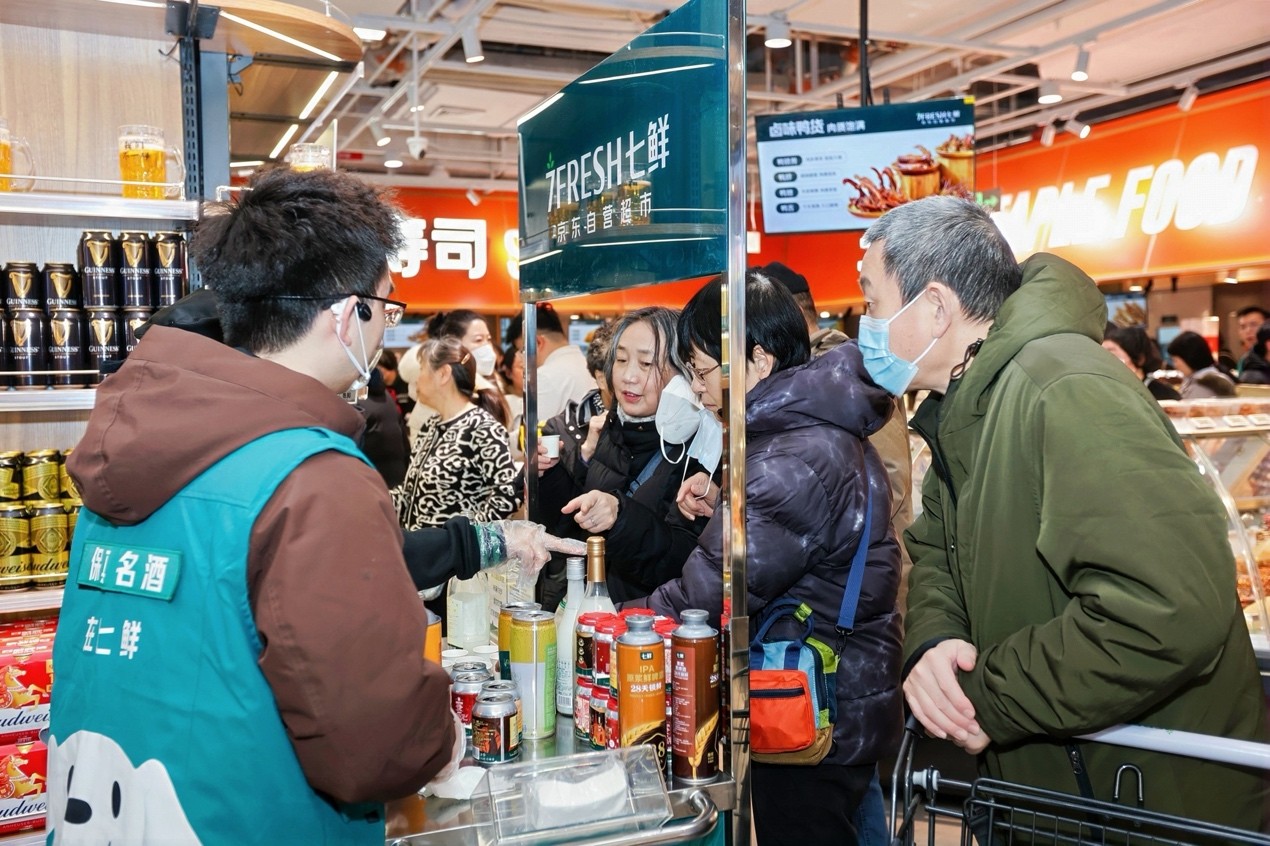 1月30日,京東七鮮超市北京西紅門薈聚店、上海浦東世紀匯店雙店同開。盡管冬日寒風凜冽,仍未阻擋市民“搶鮮”的熱情。兩家新店一大早就熱鬧非凡,果蔬、烘焙、水產、自有品牌等各個區域人氣爆棚,勾勒出京滬兩地新春消費市場的活力圖景。