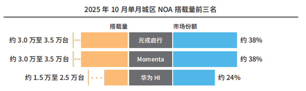 第三方智駕進入新訂單主導時代,意味著新訂單的爭奪將成為企業競爭的核心,而“技術+量產效率”正是企業爭奪新訂單的核心優勢。《白皮書》數據顯示,2025年1-10月,元戎啟行城區NOA累計搭載量達12萬至15萬臺,市場份額穩居行業前三;10月單月市占率飆升至40%,成為單月市占率最高的第三方供應商之一,其2.7倍的增長倍數,彰顯了強勁的增長勢頭。