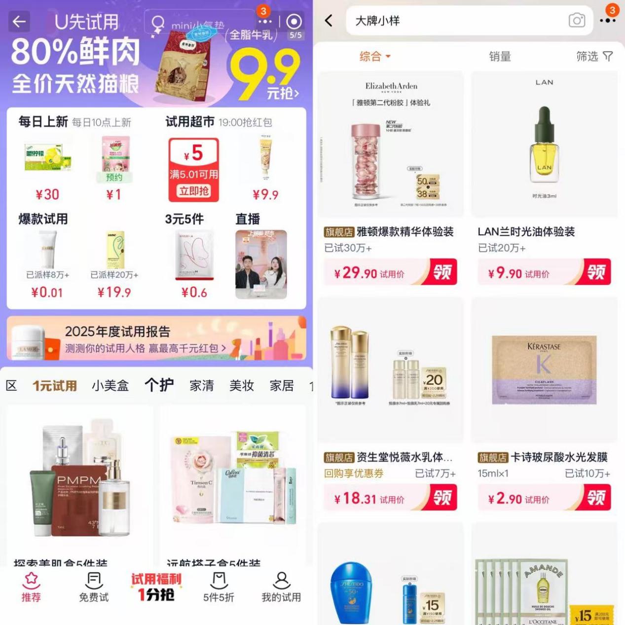 轉(zhuǎn)折點出現(xiàn)在2018年前后。以“天貓U先”為代表的線上試用平臺興起,小樣開始以極低的價格(如9.9元、19.9元)作為獨(dú)立商品售賣。消費(fèi)者只需花幾十元就能體驗海藍(lán)之謎、SK-II等高端品牌的產(chǎn)品,品牌方則通過低價小樣精準(zhǔn)觸達(dá)潛在客戶。這一模式徹底改變了小樣的屬性,從“贈品”變?yōu)椤吧唐贰保瑥摹俺杀尽弊優(yōu)椤笆杖搿薄?/p>