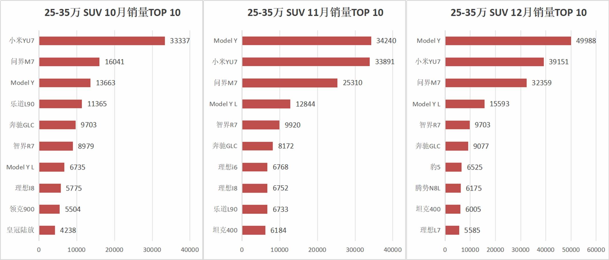 相比之下,35萬元以下的中端市場則呈現出不同的競爭邏輯。大五座SUV通過優化空間設計,在車長大多短于5100mm的情況下,實現了二排乘坐空間與行李箱容積的雙重提升。同時,新能源平臺的普及使得這類車型能夠以更低成本搭載豪華配置與智能系統,直接沖擊傳統豪華中型SUV的市場份額。特斯拉Model Y、小米YU7等車型的成功,正是這一“空間最大化”與“豪華平權”邏輯的體現。它們以25-35萬元的價格區間,提供了不輸于甚至超越35萬元以上燃油豪華車型的產品力,成為奔馳GLC、寶馬X3、奧迪Q5等傳統車型的“平替”。