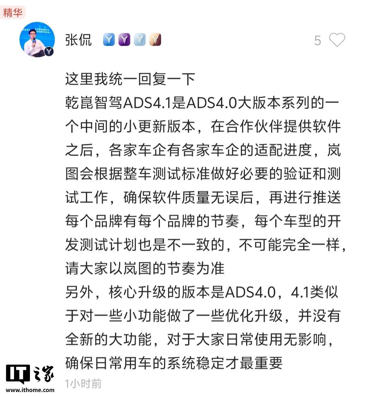 張侃特別強調,不同品牌和車型的開發測試周期存在差異,這是行業常態。用戶無需過度關注時間節點,應以嵐圖官方發布的升級計劃為準。關于版本功能,他透露ADS 4.0才是核心升級版本,而4.1版本主要針對部分功能進行細節優化,不會引入重大功能變更,日常使用體驗不會產生明顯變化。