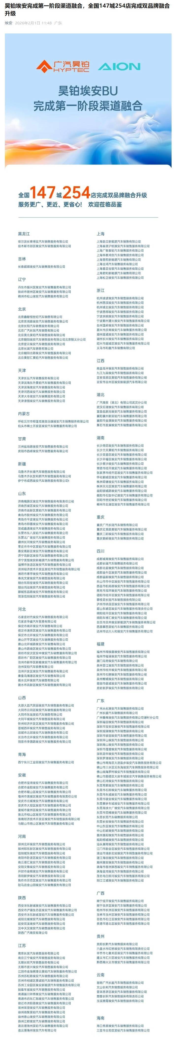 廣汽集團今日對外披露,旗下昊鉑埃安品牌已完成第一階段渠道融合工作,全國147座城市的254家門店同步完成雙品牌升級改造。這一舉措標(biāo)志著廣汽自主品牌改革進入實質(zhì)性落地階段,為后續(xù)資源整合與市場拓展奠定基礎(chǔ)。
