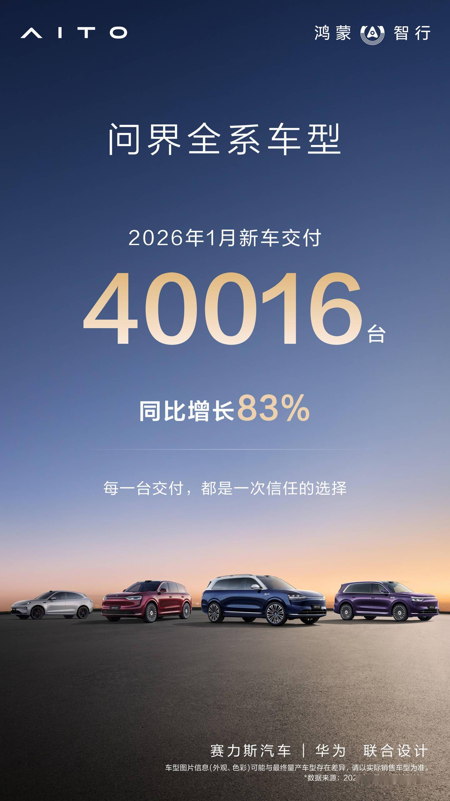 問界汽車2026年首月交付成績亮眼,同比增長超八成,鴻蒙智行同期交付也增長