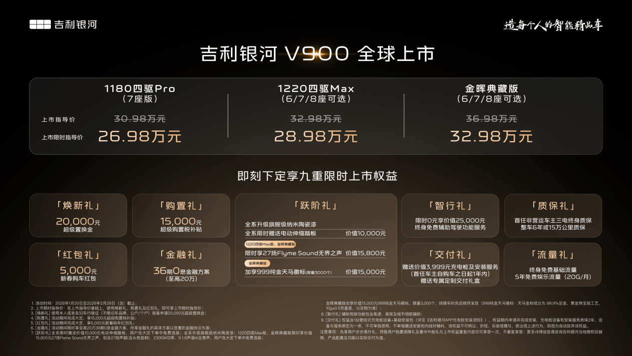 吉利汽車旗下高端品牌銀河,近日正式推出全新旗艦MPV車型——銀河V900,共帶來3款配置版本,限時售價區間為26.98萬至32.98萬元。這款主打家庭市場的車型,以“三排同權”為核心理念,通過全車均等化的舒適配置,重新定義了多人出行的體驗標準。