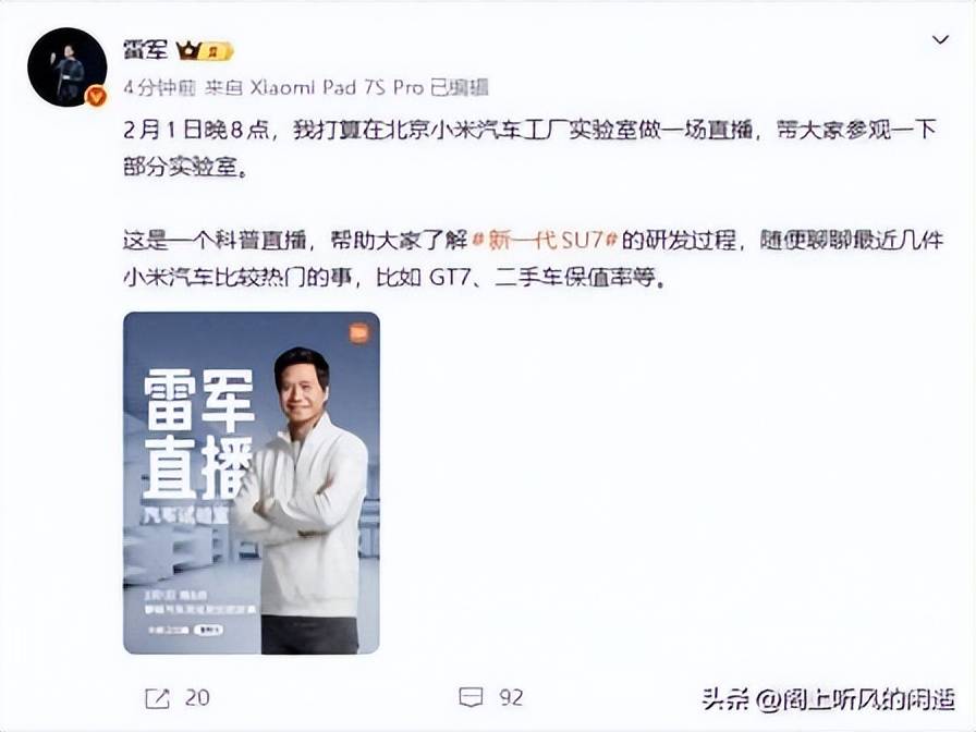 自宣布造車以來,小米始終以“透明化”溝通策略打破行業壁壘。此前拆車直播曾帶動訂單量環比增長32%,用戶對車輛“可靠性”評分提升41%;工廠直播片段二次傳播量超3億次,印證了這種溝通方式的市場影響力。此次實驗室直播不僅是新一代SU7的預熱行動,更向行業傳遞出小米深耕智能汽車技術、堅守用戶至上的戰略定位。