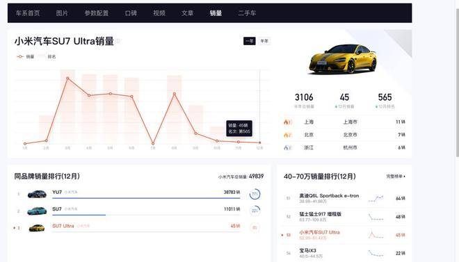 小米汽車旗下高性能純電轎車SU7 Ultra在經(jīng)歷上市初期的銷量高峰后,近期出現(xiàn)顯著回落。據(jù)第三方平臺(tái)數(shù)據(jù)顯示,該車型2025年12月單月銷量?jī)H45輛,較此前峰值時(shí)期下滑超98%。作為定位高端性能市場(chǎng)的產(chǎn)品,SU7 Ultra的銷量波動(dòng)引發(fā)行業(yè)對(duì)細(xì)分市場(chǎng)規(guī)律的關(guān)注。