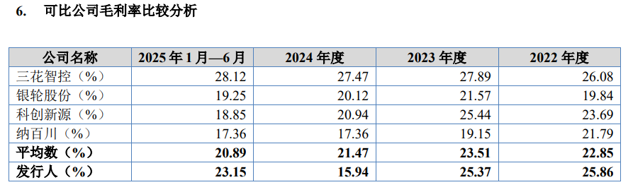 綜合毛利率方面,報(bào)告期內(nèi)公司分別為25.86%、25.37%、15.94%及23.15%。2022年及2023年,公司綜合毛利率略高于行業(yè)平均水平,但2024年出現(xiàn)明顯下滑,主要受電池液冷板毛利率下降及產(chǎn)品結(jié)構(gòu)變化影響。2025年上半年,綜合毛利率有所回升,反映出公司業(yè)務(wù)調(diào)整的初步成效。