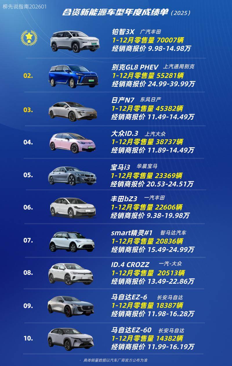 合資新能源加速崛起:2025年銷量前5車型出爐,鉑智3X年銷超7萬領跑
