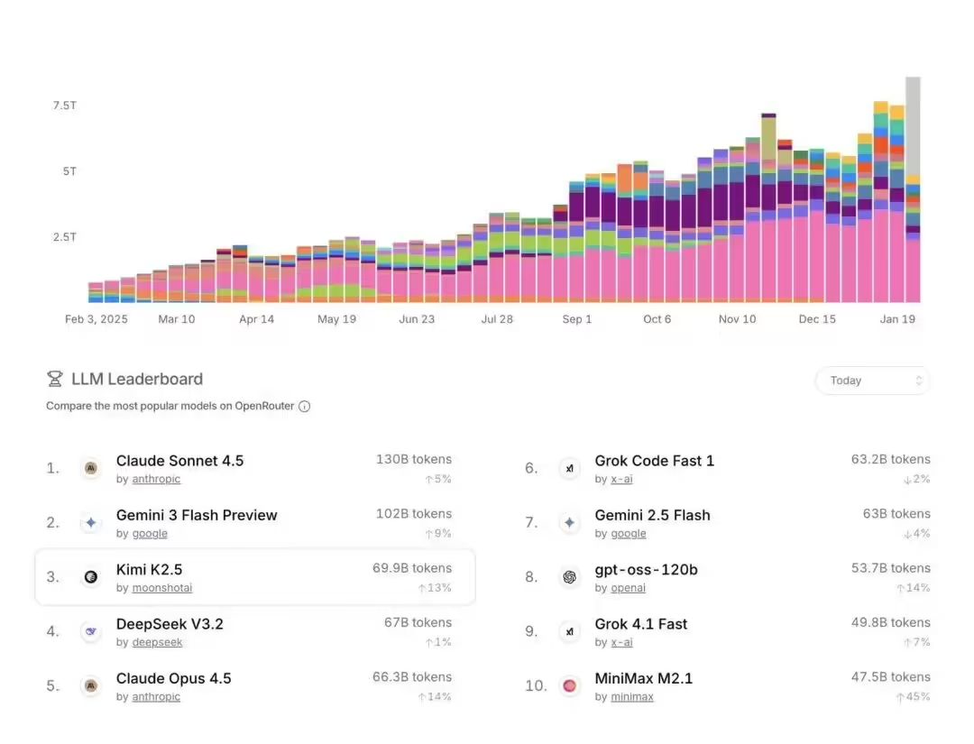 在行業評測平臺Openrouter上,K2.5的表現同樣可圈可點,目前排名已躍升至第三位,緊隨Claude Sonnet 4.5和Gemini 3 Flash之后,彰顯了其技術實力和市場競爭力。
