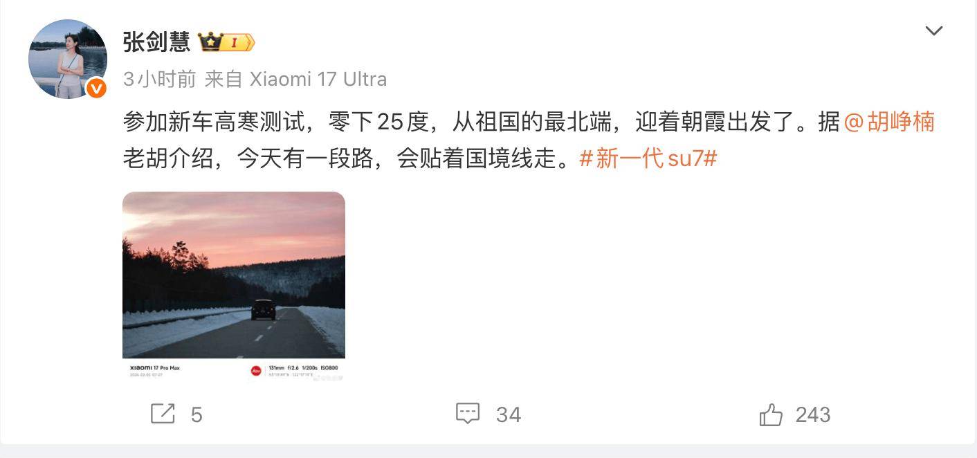 小米集團副總裁兼采購委員會主席張劍慧近日在社交平臺發(fā)布動態(tài),透露其參與小米新車高寒測試的行程細節(jié)。他提到測試路線中有一段緊貼國境線行駛,并分享了車輛動態(tài)畫面,圖中可見測試車小藍燈處于點亮狀態(tài)。