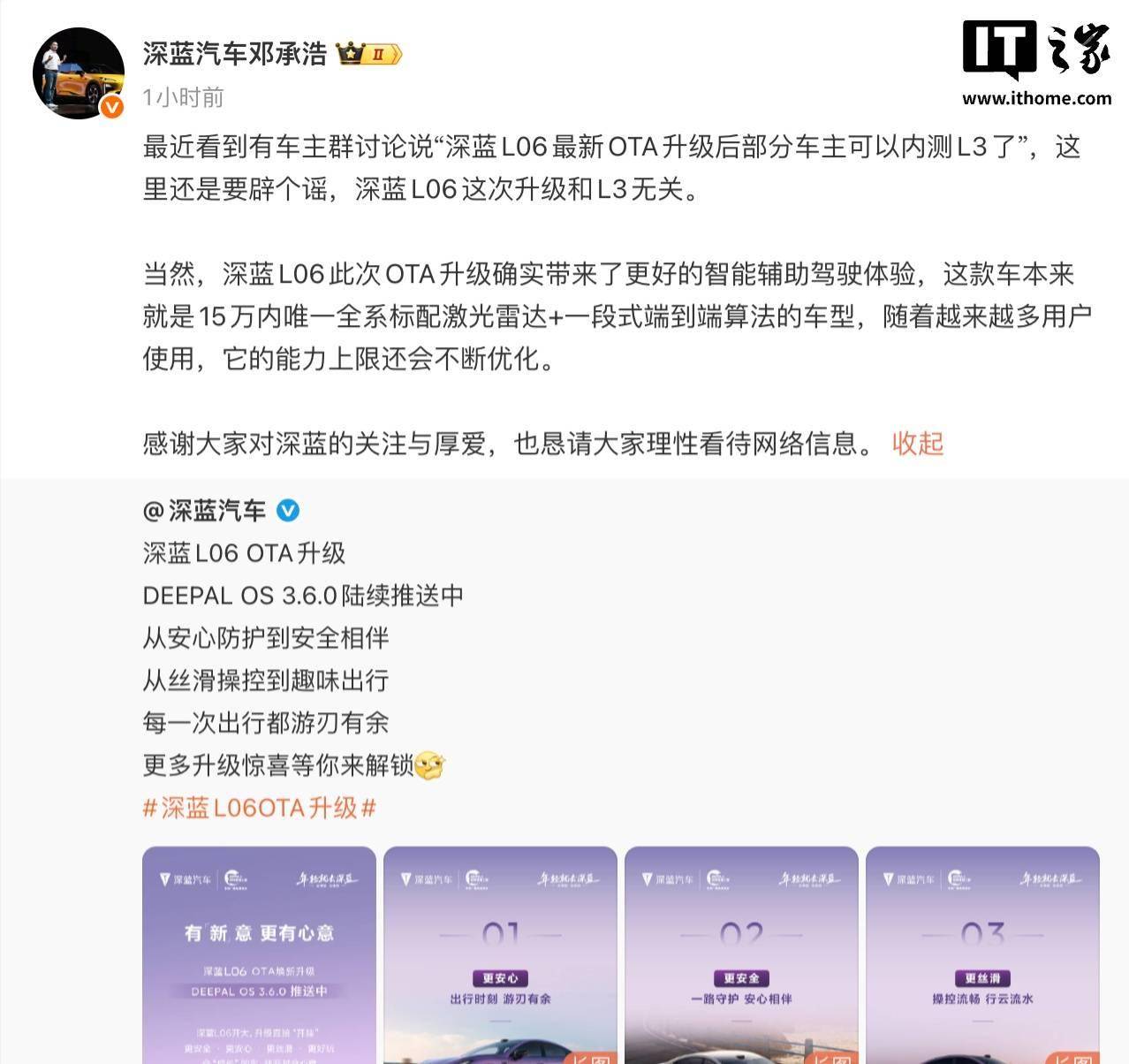 然而,近期有車主群中流傳一則消息,稱深藍L06在最新OTA升級后,部分車主可以內測L3級自動駕駛功能。對此,深藍汽車董事長鄧承浩迅速作出回應,明確表示此次升級與L3級自動駕駛無關,并強調升級確實為新車帶來了更好的智能輔助駕駛體驗。