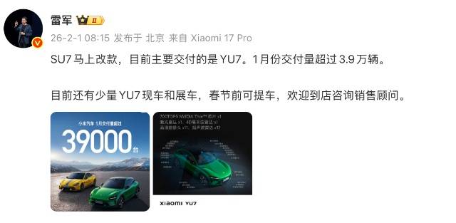 雷軍在回應市場關切時表示:"SU7改款工作已進入最后階段,當前交付重心完全轉向YU7。"他特別強調,全國門店仍有少量YU7現車及展車可供選擇,春節前可完成全部提車手續。消費者可通過線下渠道與銷售顧問直接溝通,獲取個性化購車方案及交付時間表。