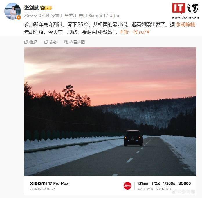 與此同時,小米集團副總裁張劍慧也在社交媒體透露了新車測試進展。她表示正在參與高寒環境下的車輛測試,并提到當天測試路線將沿著國境線行駛。從其分享的圖片中可以看到,測試車輛在行駛過程中點亮了小藍燈,展現了車輛動態狀態。