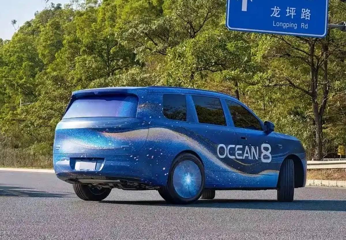 從設計語言來看,海獅08展現出硬朗大氣的風格特征。其車身線條平直舒展,前臉采用分體式大燈組設計,車頂配備激光雷達裝置。車尾部分設計簡潔,預計采用貫穿式尾燈布局,頂部延伸出擾流板造型。測試諜照顯示,該車在轉彎時后輪呈現明顯轉向角度,印證了其搭載后輪轉向技術的猜測。