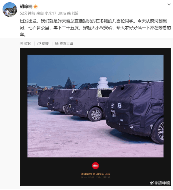 近日,順為資本投資合伙人胡崢楠在社交平臺發布了一組偽裝測試車的照片,引發汽車行業關注。照片中四臺身著重度偽裝的SUV測試車正在極寒環境中行駛,配文顯示測試路線從漠河延伸至黑河,全程七百多公里,期間經歷零下二十五度的低溫考驗,穿越大小興安嶺區域。這一動態被解讀為小米汽車正在為全新車型進行關鍵驗證。