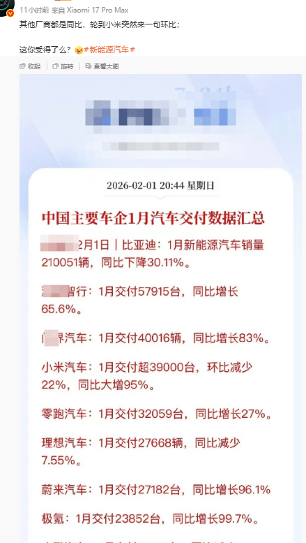 近期,小米汽車在輿論場(chǎng)中遭遇了不小的風(fēng)波,盡管銷量數(shù)據(jù)表現(xiàn)亮眼,但仍被部分聲音刻意唱衰。這一現(xiàn)象在1月車企銷量數(shù)據(jù)公布后尤為明顯,主流媒體在報(bào)道時(shí)對(duì)小米采用了環(huán)比數(shù)據(jù),與其他車企普遍使用的同比數(shù)據(jù)形成對(duì)比,引發(fā)了外界對(duì)小米的質(zhì)疑。然而,若以同比口徑計(jì)算,小米增速位居前列;即便采用環(huán)比數(shù)據(jù),其跌幅也遠(yuǎn)低于行業(yè)平均水平。