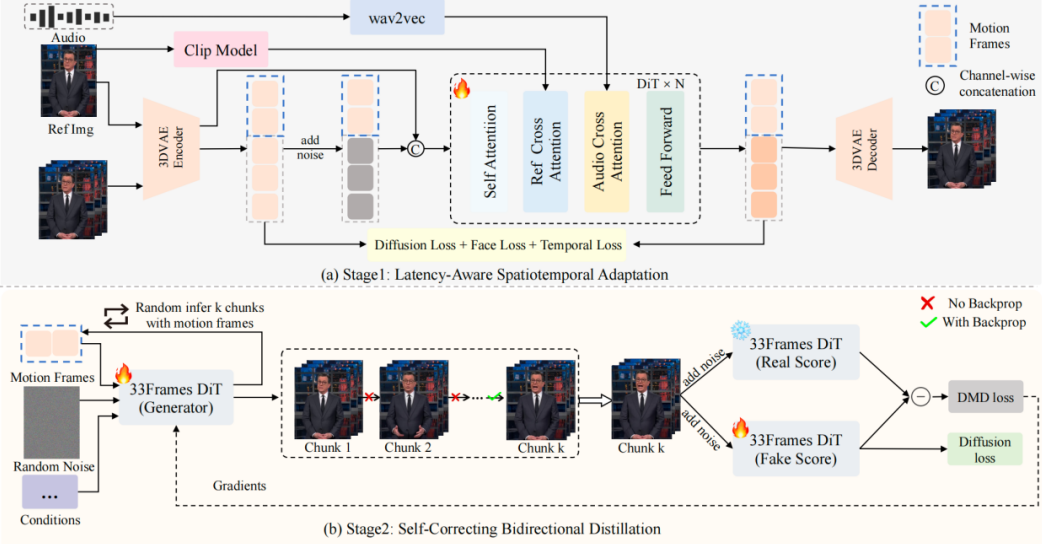 第二階段:自糾正雙向蒸餾 (Self-Correcting Bidirectional Distillation)。利用 DMD 框架壓縮采樣步數并移除無分類器引導(CFG),實現加速;多步回溯自糾正機制,通過 autoregressively 合成連續分塊(最多 K個chunks),顯式模擬長視頻生成的誤差傳播;隨機截斷策略,在訓練中在第 k(< K)個分塊數進行反向傳播,實現高效且無偏的顯存友好優化。