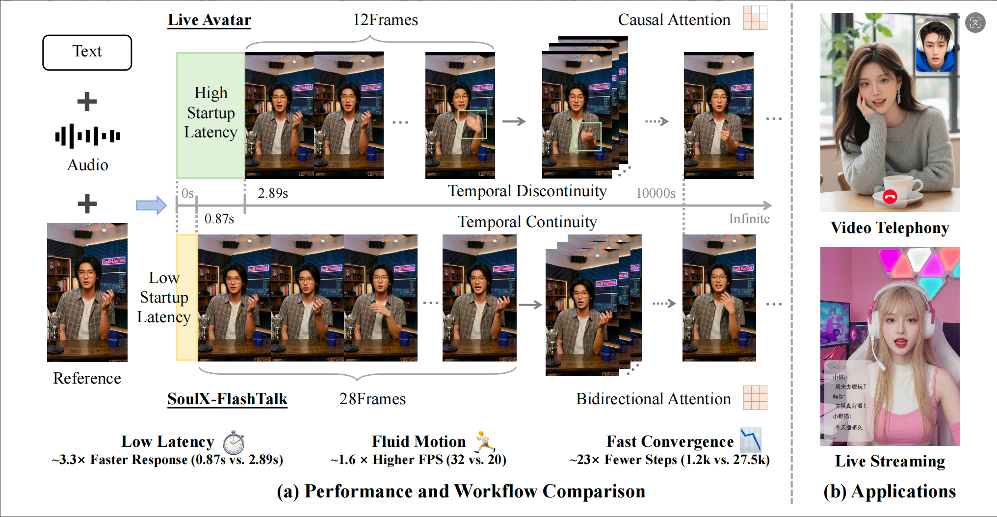 ?超長視頻,穩定生成: 不同于傳統的單向依賴,SoulX-FlashTalk 完全保留了雙向注意力機制,讓每一幀生成都能同時參考過去與隱含的未來上下文,從根本上壓制身份漂移,這意味著在超長直播中,主播的口型、面部細節和背景環境將始終保持一致,不會出現模糊或變形。