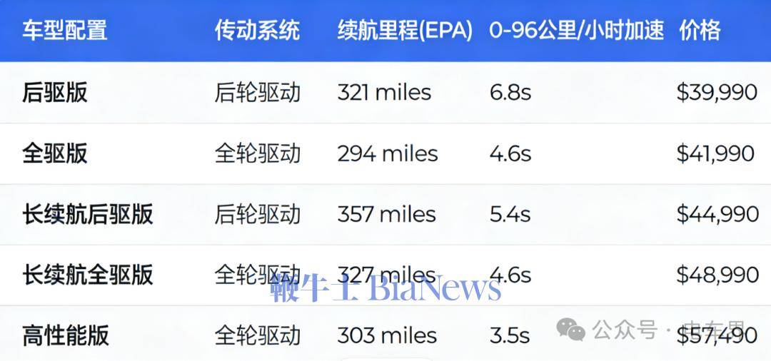 在命名體系方面,特斯拉正式停用"標準版"標識,轉而采用后驅(RWD)、全輪驅動(AWD)和尊享版(Premium)的分級方式。原標準后驅版現更名為Model Y后驅版,以39,990美元的價格繼續擔任最經濟實惠的選擇。新增的非尊享全驅版則比后驅版高出2,000美元,形成更明確的價格梯度。