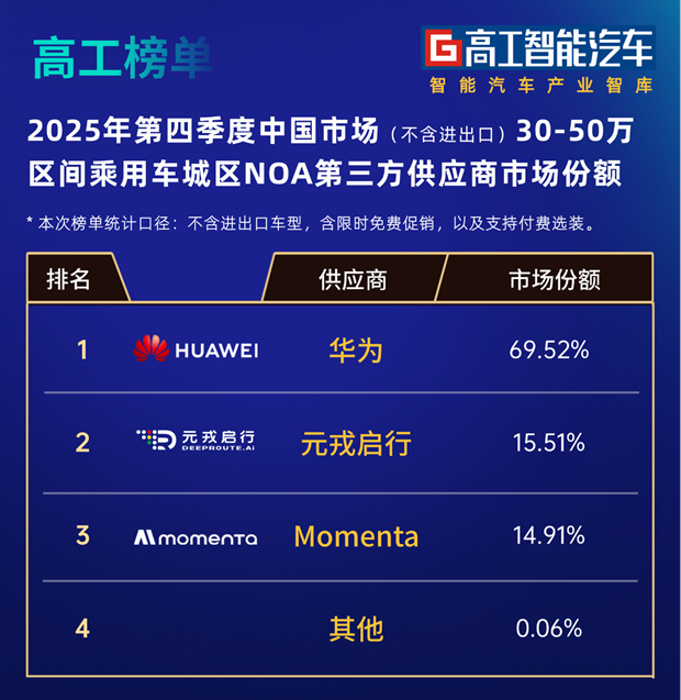 數據來源:《2025年第四季度中國市場(不含進出口)30-50萬價格區間乘用車城區NOA第三方供應商市場份額榜單》