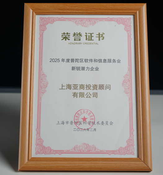 2026年2月2日,上海普陀——在普陀區2026年軟信業重點企業座談會上,上海亞商投資顧問有限公司(以下簡稱"亞商投顧")憑借其在金融科技領域的創新突破和卓越表現,榮獲"2025年度普陀區軟件和信息服務業新銳潛力企業"稱號。作為一家以軟件信息技術為基礎、深耕金融科技賽道的創新型企業,亞商投顧的獲獎不僅體現了企業自身的技術實力和市場價值,更彰顯了普陀區智能軟件產業生態的持續優化和金融科技細分賽道的蓬勃活力。