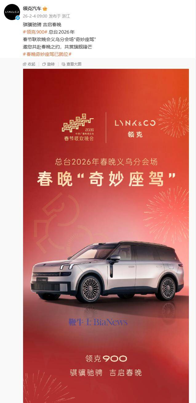 近日,領克汽車官方通過社交媒體平臺對外發布了一則重磅消息:領克900正式成為總臺2026年春節聯歡晚會義烏分會場的指定用車,被賦予“奇妙座駕”的特別稱號。這一合作不僅展現了領克品牌在高端市場的布局,也為其旗艦車型領克900增添了獨特的文化內涵。
