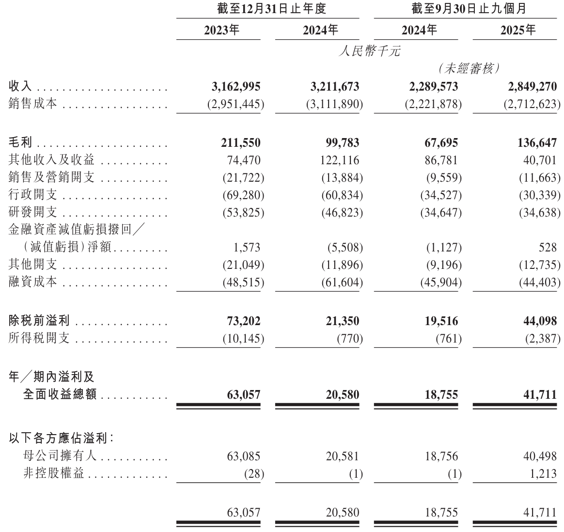 根據(jù)招股書披露的財務(wù)數(shù)據(jù),銅博科技在2023年實現(xiàn)營業(yè)收入31.63億元,毛利2.12億元,期內(nèi)利潤6306萬元;2024年營收微增至32.12億元,但毛利下降至9978萬元,期內(nèi)利潤縮減至2058萬元。進(jìn)入2025年后,公司經(jīng)營狀況有所改善,前9個月營收達(dá)28.49億元,毛利1.37億元,期內(nèi)利潤回升至4171萬元。