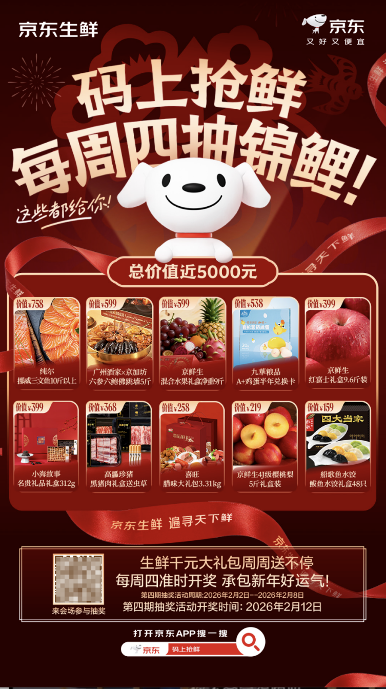 整個(gè)年貨節(jié)期間,“碼上搶鮮”千元年貨大禮包抽獎(jiǎng)活動(dòng)持續(xù)開(kāi)展,消費(fèi)者購(gòu)買(mǎi)指定年貨禮盒后,掃描禮盒腰封二維碼或搜索“碼上搶鮮”即可參與報(bào)名,每周抽取一位“年貨錦鯉”。目前,第四期抽獎(jiǎng)已火熱開(kāi)啟,獎(jiǎng)品包含10斤以上純爾挪威三文魚(yú)、5斤廣州酒家x京加坊六參六鮑佛跳墻、9斤京鮮生混合水果禮盒等,總價(jià)值近5000元,最終結(jié)果將于2月12日公布,邀消費(fèi)者一起“接好運(yùn)”、添年味。