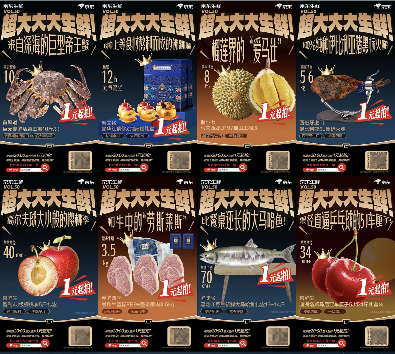此外,還有超大生鮮1元起拍活動(dòng),匯聚了全球珍稀好物。不論是單只10斤重的俄羅斯巨無(wú)霸帝王蟹、海文銘豪華紅頂佛跳墻6罐禮盒、單果8斤重的馬來(lái)西亞D197貓山王榴蓮,還是西班牙進(jìn)口伊比利亞5J黑標(biāo)火腿、單枚超過(guò)500g克的澳洲鸝鶴蛋、澳洲5J級(jí)車(chē)?yán)遄拥?,統(tǒng)統(tǒng)1元起拍,為新春增添更多驚喜與樂(lè)趣。