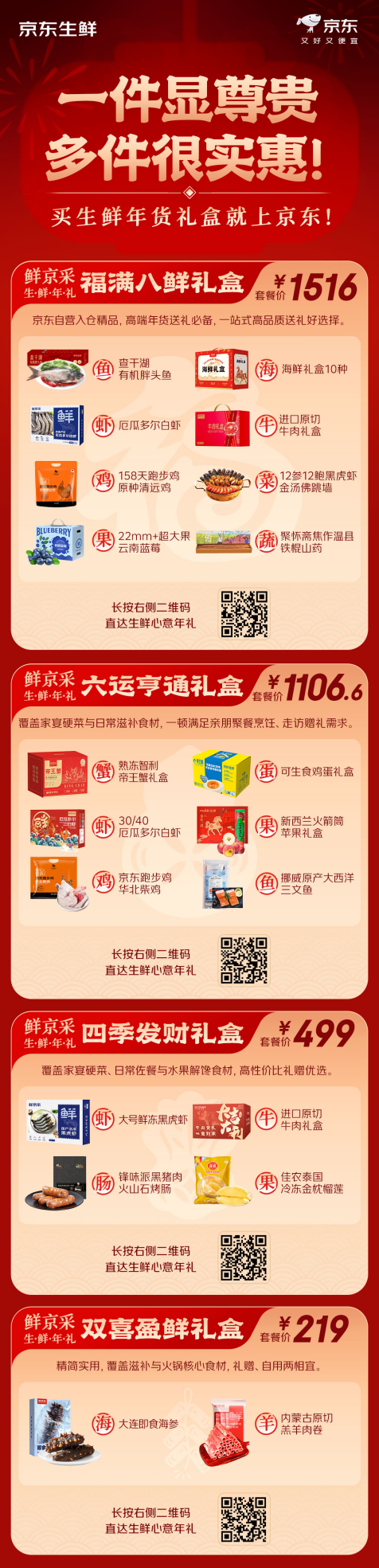 為了讓消費(fèi)者能更實(shí)惠地將各色年貨禮盒帶回家,京東生鮮還特別推出了聚合型年貨禮盒套裝,打造高性?xún)r(jià)比購(gòu)買(mǎi)方案。其中,鮮京采福滿八鮮禮盒精選查干湖有機(jī)胖頭魚(yú)、厄瓜多爾白蝦、清遠(yuǎn)跑步雞、云南藍(lán)莓等8款優(yōu)質(zhì)禮盒,是高端贈(zèng)禮的體面之選;六運(yùn)亨通禮盒涵蓋帝王蟹、跑步雞、三文魚(yú)等宴客硬菜與日常食材,輕松滿足親友聚餐與走親訪友的雙重需求;四季發(fā)財(cái)禮盒精選黑虎蝦、原切牛肉、金枕榴蓮等兼具品質(zhì)與實(shí)用性的美味;雙喜盈門(mén)禮盒則聚焦即食海參與羔羊肉卷,精簡(jiǎn)實(shí)用,無(wú)論是贈(zèng)禮還是自家享用都十分合適。