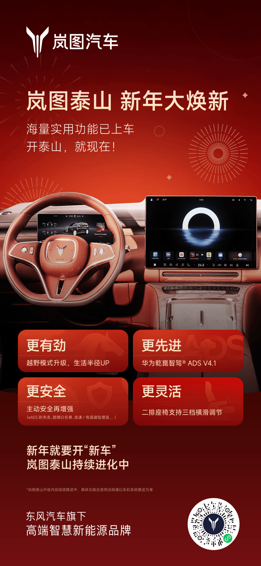 嵐圖汽車近日宣布,旗下嵐圖泰山車型正式開啟首次OTA升級,此次升級以華為乾崑智駕ADS 4.1系統為核心,在智能駕駛、越野性能及智能座艙三大領域實現全面優化,為用戶帶來更智能、更安全的出行體驗。