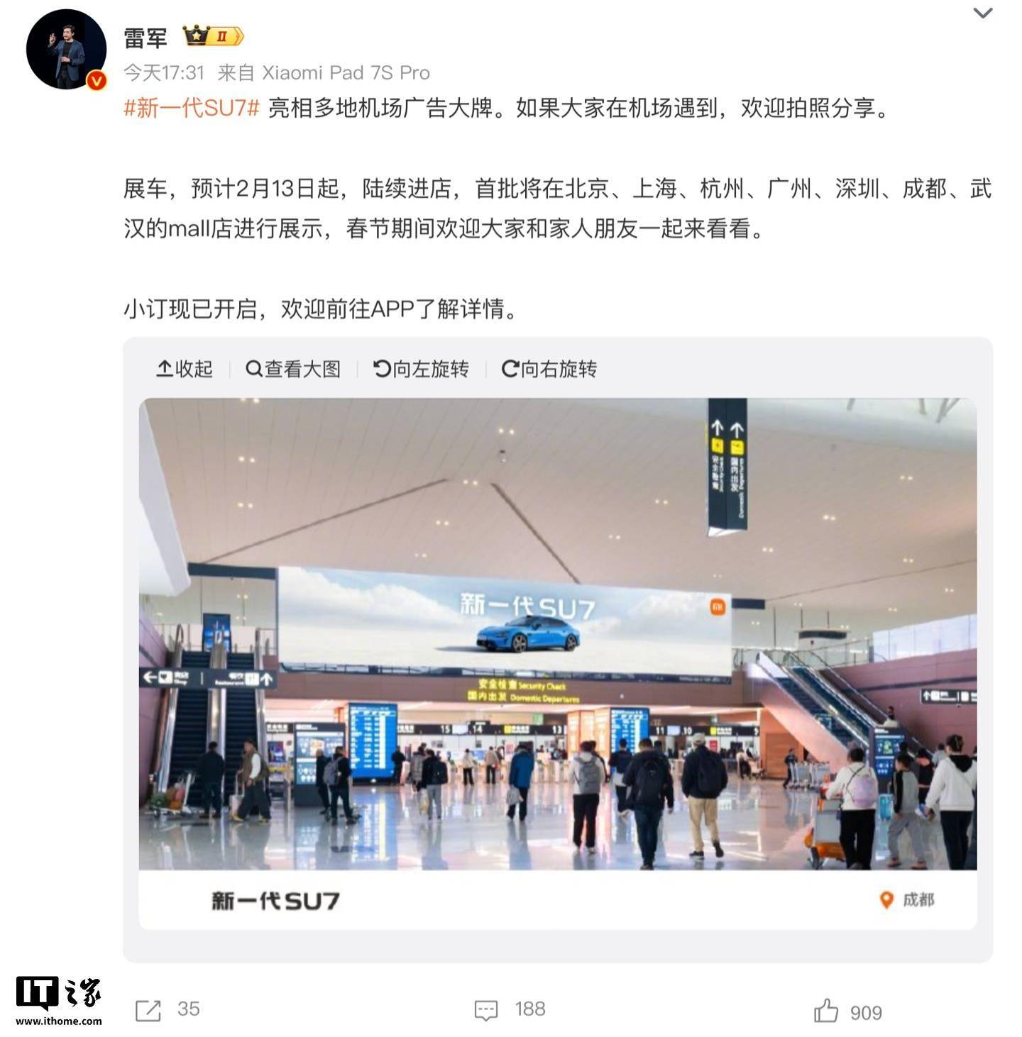 近日,小米汽車創(chuàng)始人雷軍通過社交媒體宣布,新一代小米SU7已正式登陸多地機場廣告位,引發(fā)廣泛關注。他在微博中表示:“若在機場偶遇,歡迎拍照分享。”根據(jù)其發(fā)布的照片水印顯示,首張廣告出現(xiàn)在成都雙流國際機場。