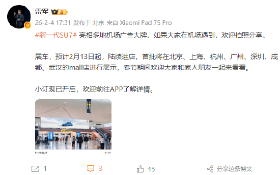 雷軍官宣:新一代SU7多地機場廣告亮相,2月13日起首批展車進駐北上杭廣深等七城