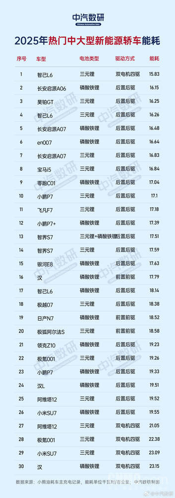 中汽數研近日公布了2025年熱門中大型新能源汽車能耗榜單,涵蓋轎車與SUV兩大類別。數據顯示,智己L6以15.83的能耗表現成為新能源轎車領域能耗最低的車型,而別克E5則以16.92的能耗成績領跑新能源SUV市場。