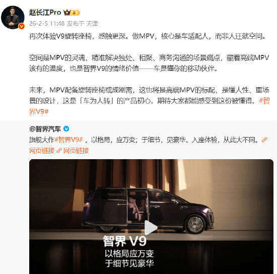 在高端MPV市場,空間設計與用戶需求的契合度正成為競爭焦點。智界汽車執行董事趙長江近日公開表示,MPV的核心設計理念應是“車適配人”,而非讓用戶被動適應空間布局。他強調,真正的高端MPV需要精準解決獨處、社交、商務等多元場景下的使用痛點,通過空間設計傳遞情感價值。