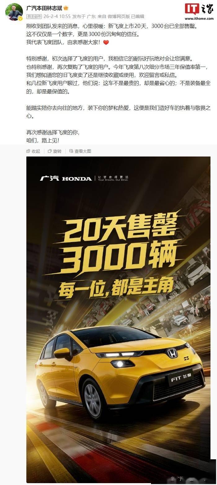 廣汽本田汽車有限公司副總經(jīng)理林志斌透露,為確保發(fā)售秩序和用戶權(quán)益,公司已于2月3日17:30系統(tǒng)訂單量接近限量額度時(shí),正式通知全國特約店停止接收新訂單。這一舉措旨在避免超售情況發(fā)生,同時(shí)保障已訂車用戶的交付體驗(yàn)。據(jù)介紹,該限量車型后續(xù)將不再安排生產(chǎn)。