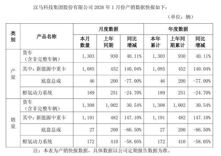 漢馬科技2026年1月:新能源中重卡銷量大增 底盤與醇氫動力系統銷售下滑