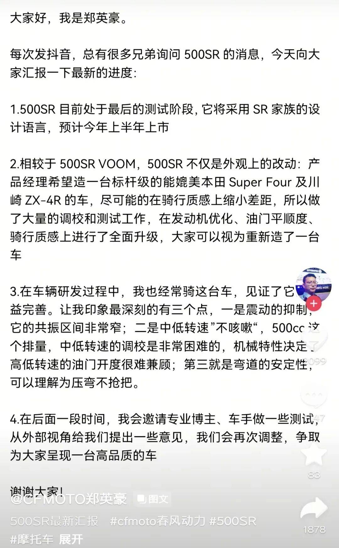 近日,春風動力高層正式對外披露了旗下中量級四缸仿賽車型500SR的研發細節,并明確表示該車將于今年上半年正式登陸市場。這一消息迅速引發摩托車愛好者的廣泛關注,尤其是對SR家族化設計風格情有獨鐘的車迷群體。